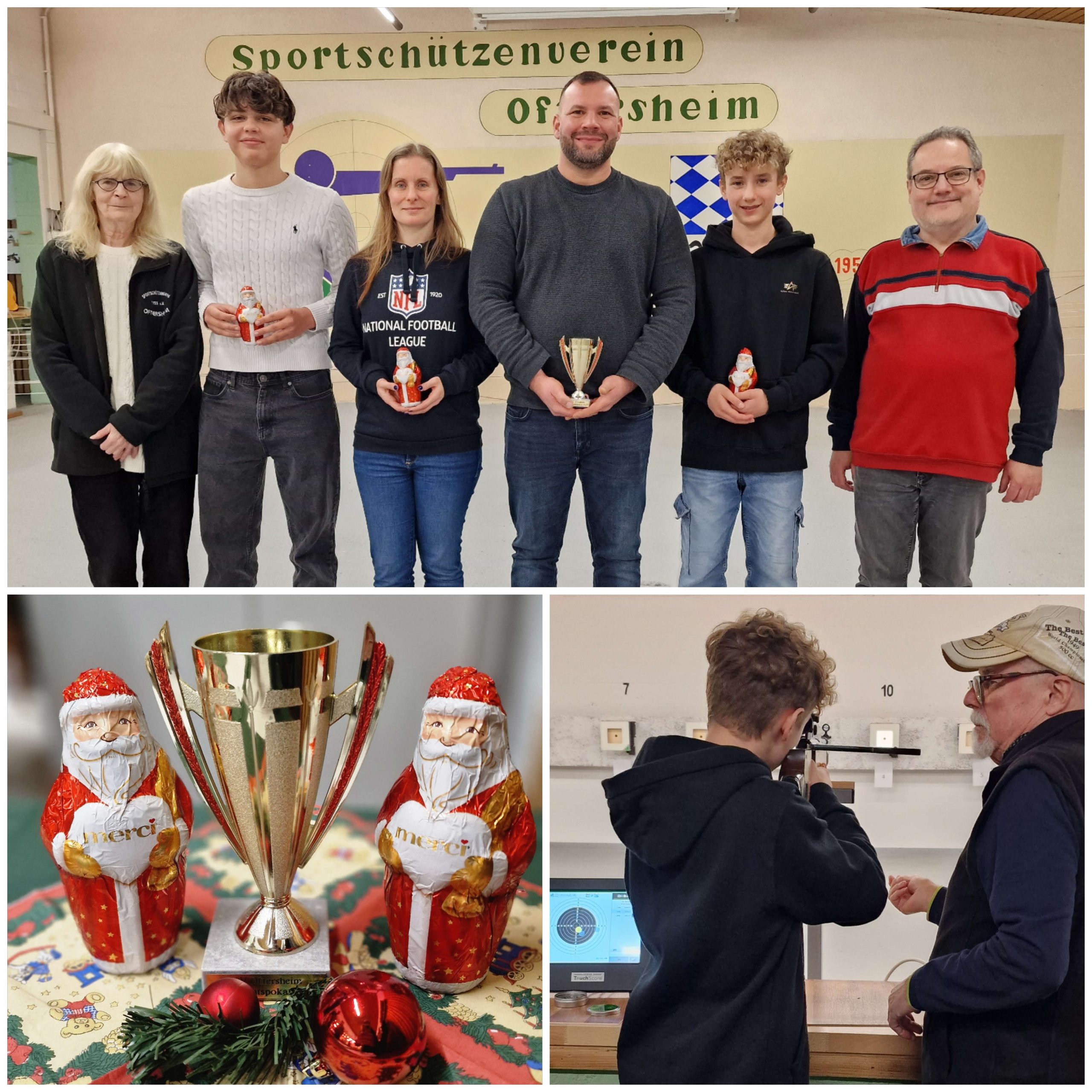 ob sich der positive Trend, der sich beim Schnupperschießen angedeutet hatte. fortsetzen würde. Sie wurden nicht enttäuscht: überraschend viele machten sich auf den Weg ins Schützenhaus, um für sich und ihre Lieben Süßes in Form von Schokoweihnachtsmännern mit nach Hause nehmen zu können. Aber nicht nur Süßes war das Ziel der schießsportinteressierten Besucher. der Weihnachtspokal winkte als Preis für den treffsichersten Schützen. Auf eine Glücksscheibe mit Weihnachtsmotiven waren 5 Schüsse abzugeben, was eine maximale Punktzahl von 125 Punkten ergab. Nach Ende der offiziellen Schießzeit hatten vier Teilnehmer diese Höchstpunktzahl erreicht, was für ein gutes Auge und eine ruhige Hand sprach und ein Stechen notwendig machte. Eine gewisse Nervosität war den Teilnehmern nicht abzusprechen , als es im Stechen darum ging, 3 Wertungsschüsse auf eine Ringscheibe abzugeben. Hier zeigte sich Markus Große als nervenstark und sicherte sich mit 27 Ringen den Weihnachtspokal. Auf den Plätzen folgten Stefanie Bechtold ( 20 Ringe ), Elias Große (18 Ringe ) und Dominik Wehner (14 Ringe ). Bei der anschließenden Siegerehrung konnte Markus Große aus den Händen von Schützenmeisterin Dagmar Schwinghammer den Weihnachtspokal entgegennehmen.